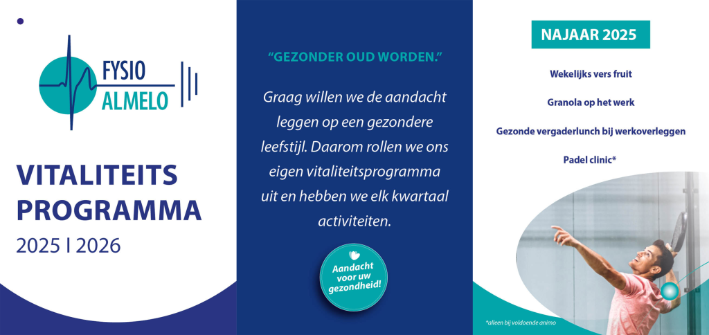 De waaier laat op een overzichtelijke manier zien welke onderdelen bijdragen aan gezondheid en welzijn, en is volledig gestyled in de kenmerkende huisstijl van Fysio Almelo: lichtblauw en wit. Zo ontstaat een frisse, herkenbare en praktische tool die medewerkers motiveert om het aankomende jaar gezond en vitaal te blijven.